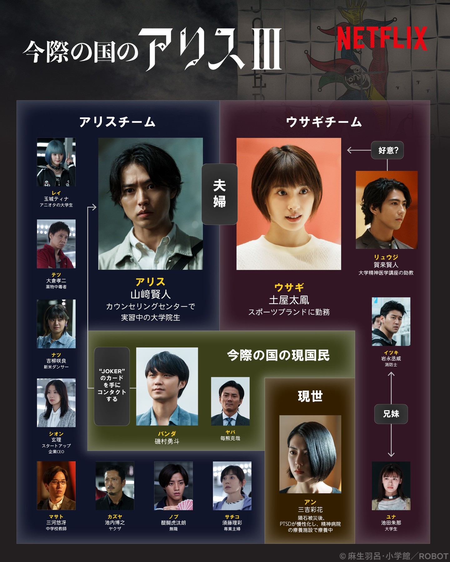 모든 기억을 잃고 아내의 실종에 망연자실해 있는 아리스 앞에, 예상치 못한 인물이 나타납니다. 그는 바로 시즌 2에서 '임종의 나라'의 국민이 되기를 선택했던, 순수한 악 그 자체라고 할 수 있는 인물 '반다'(이소무라 하야토 분)였습니다. 현실 세계에 어떤 방법으로 나타난 것인지 알 수 없는 그는 아리스에게 의문의 '조커' 카드를 건네며 "모든 것을 기억해내라"는 섬뜩한 메시지를 남기고 사라집니다. 처음에는 영문을 알 수 없는 일이라 치부했던 아리스였지만, 사랑하는 아내 우사기가 사라진 지금, 그는 반다의 말이 우사기를 찾을 유일한 단서임을 직감합니다.